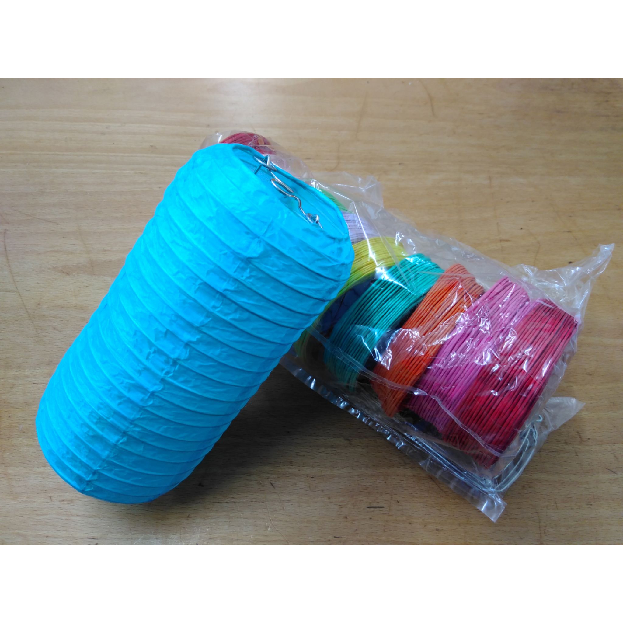 Sausage-shape assorted colour mini paper lanterns with metal expander/hanger, pack of 10