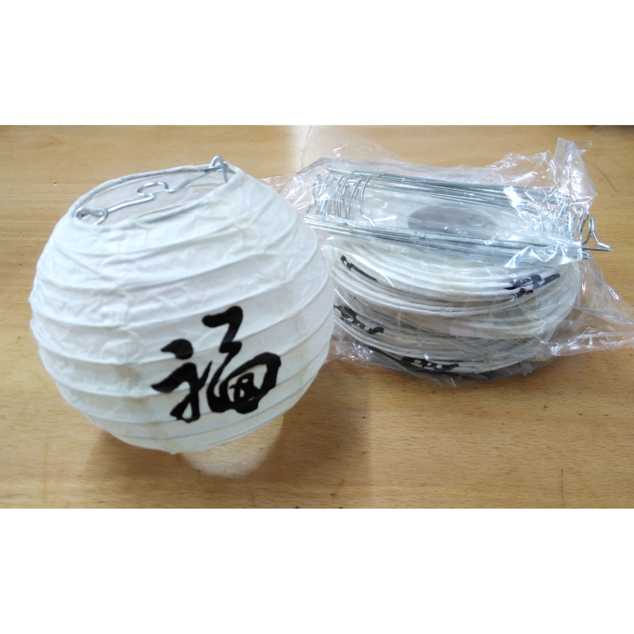 Round globe white mini paper lantern decorated with various Chinese characters in black, with metal expander/hanger, pack of 10
