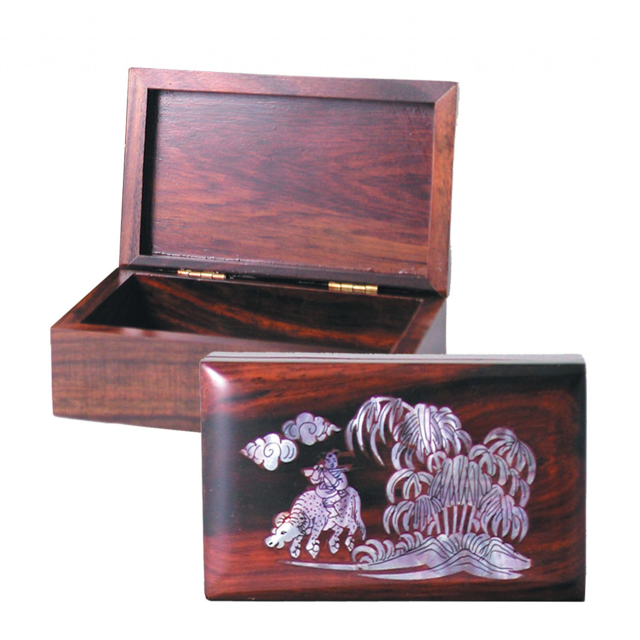 Polished mahogany box with mother-of-pearl inlay showing a buffalo being ridden through a bamboo grove.