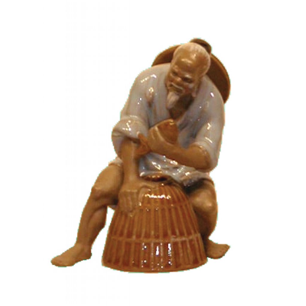 Fisherman in white shirt collecting catch from fish trap basket. Shiwan pottery with richly glazed detail and unglazed skin tones.