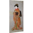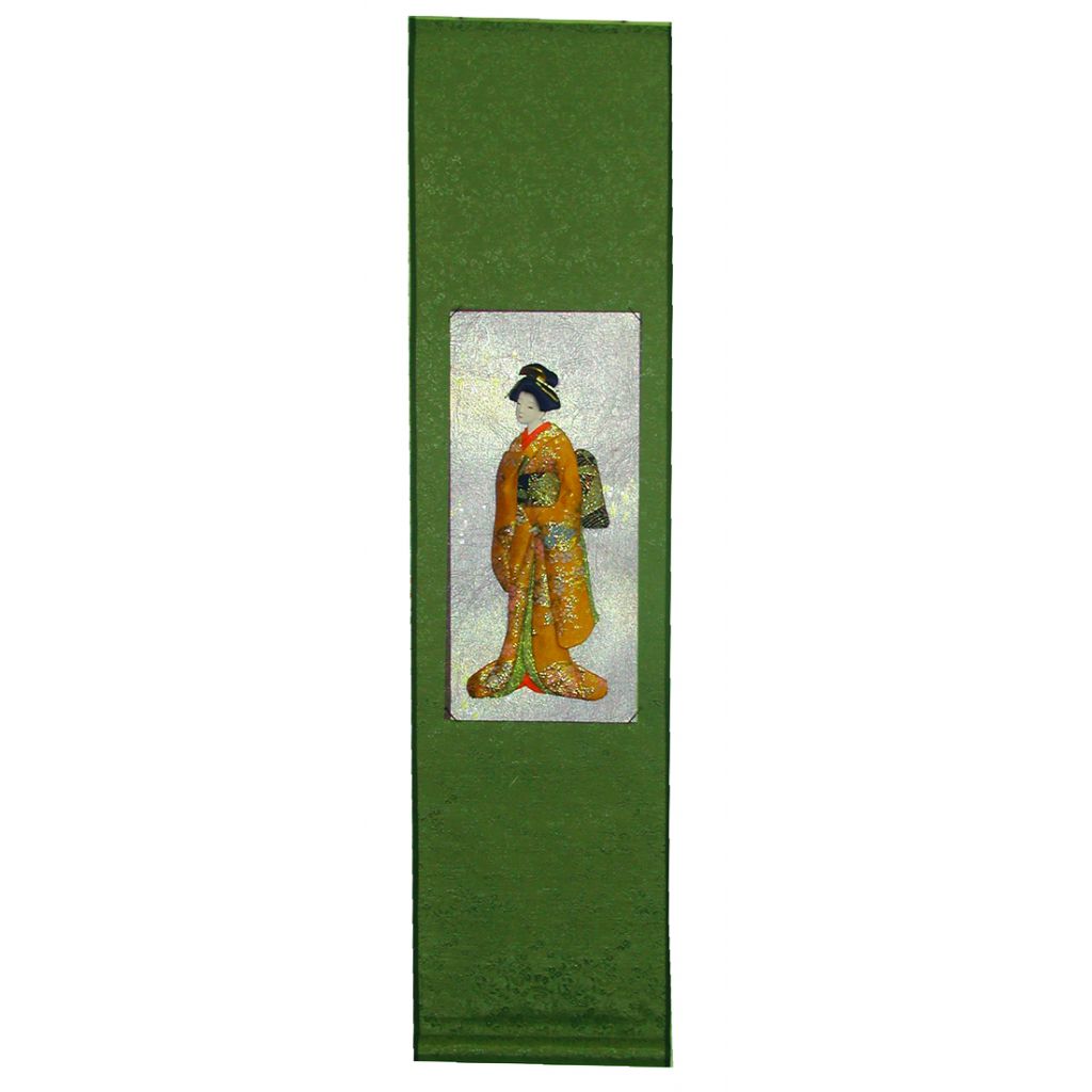 Doll picture Scroll of Japanese lady in orange and pink brocade kimono. Lavishly dressed relief picture mounted on decorative backing with scroll for display.
