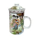 White porcelain mug with beautiful ladies and cranes in a palace garden scene. Includes porcelain strainer insert to catch your chinese tea leaves and matching lid to keep your tea warm.