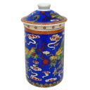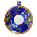 White porcelain mug with two golden dragons amid clouds on a blue background. Includes porcelain strainer insert to catch your chinese tea leaves and matching lid to keep your tea warm.
