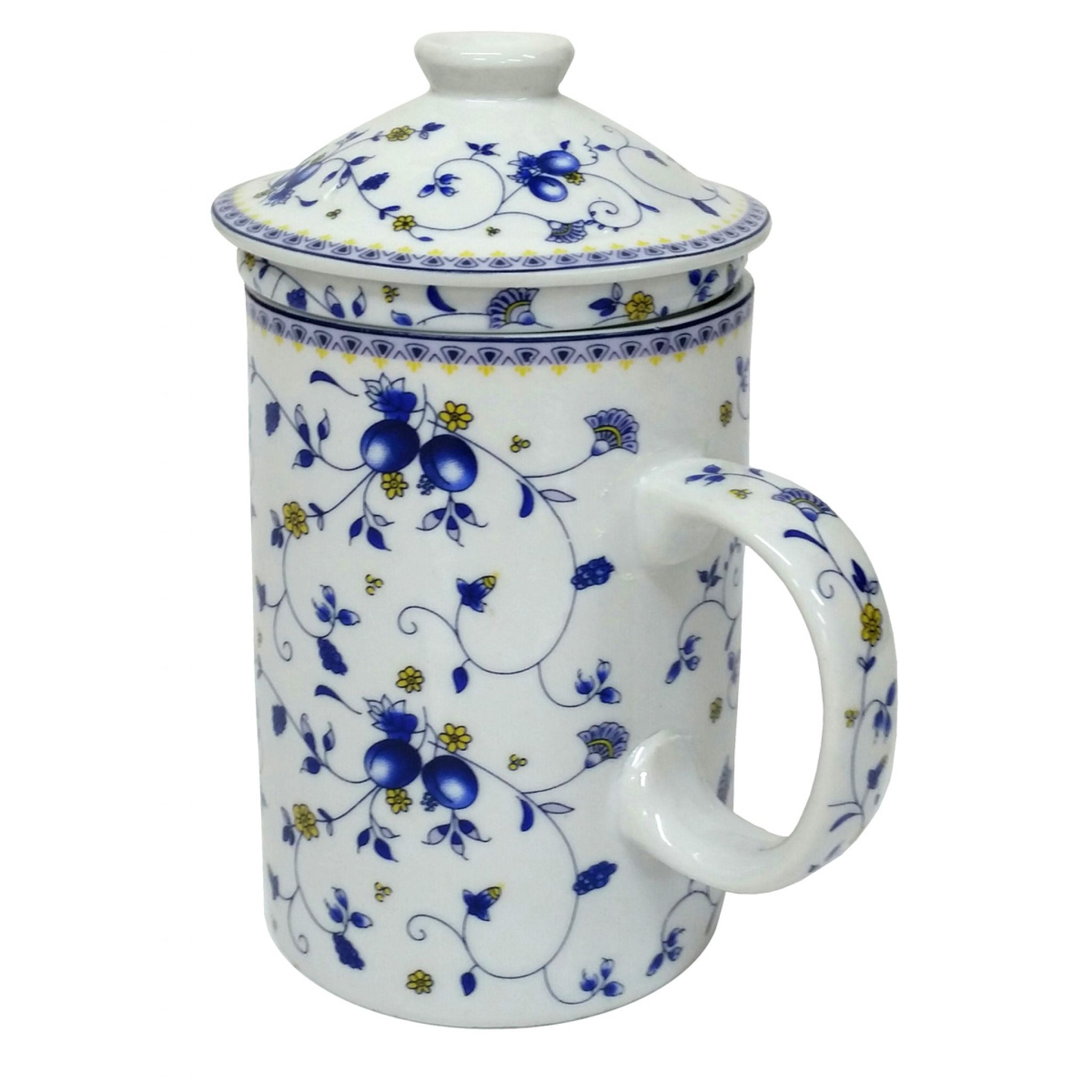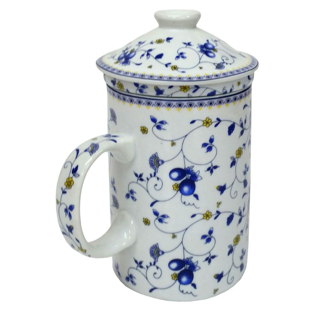 White porcelain mug with a trailing fruit vine design. Includes porcelain strainer insert to catch your chinese tea leaves and matching lid to keep your tea warm.