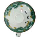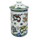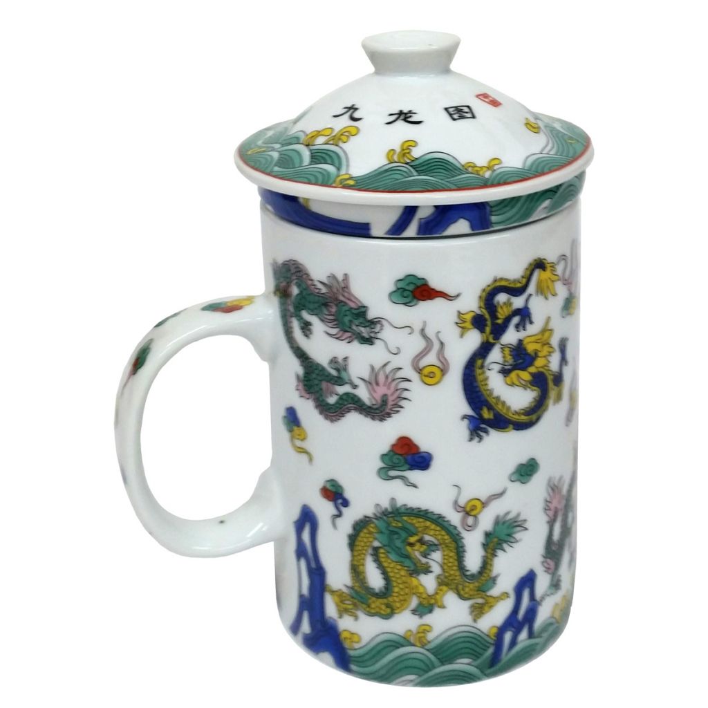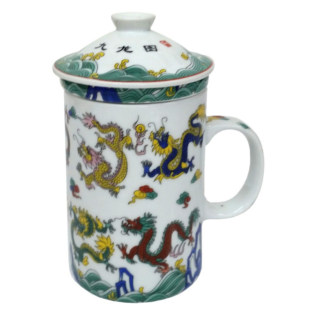 White porcelain mug with a pattern of nine flying dragons with clouds and flames. Includes porcelain strainer insert to catch your chinese tea leaves and matching lid to keep your tea warm.
