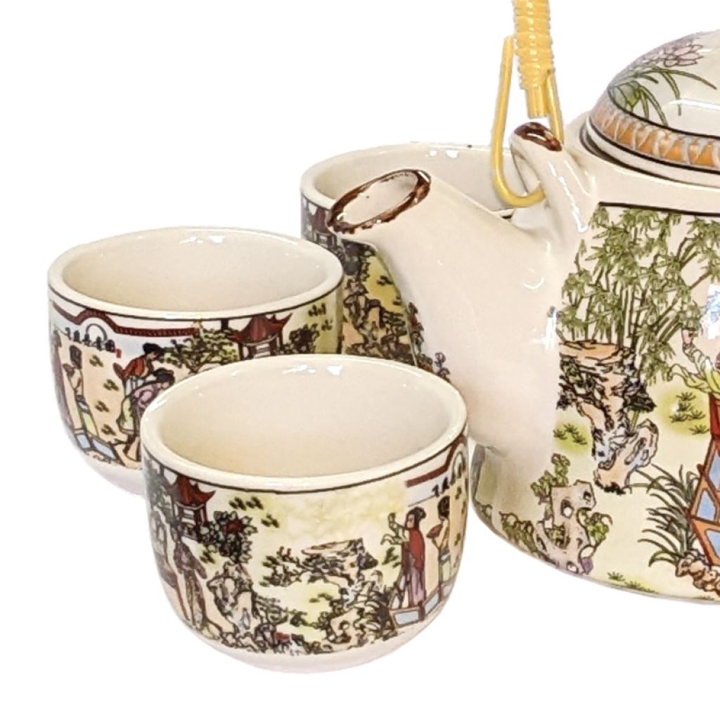 White porcelain traditional teapot decorated with a colourful scene of ladies in a palace garden. Includes flexible handle and metal insert strainer along with six matching cups .
