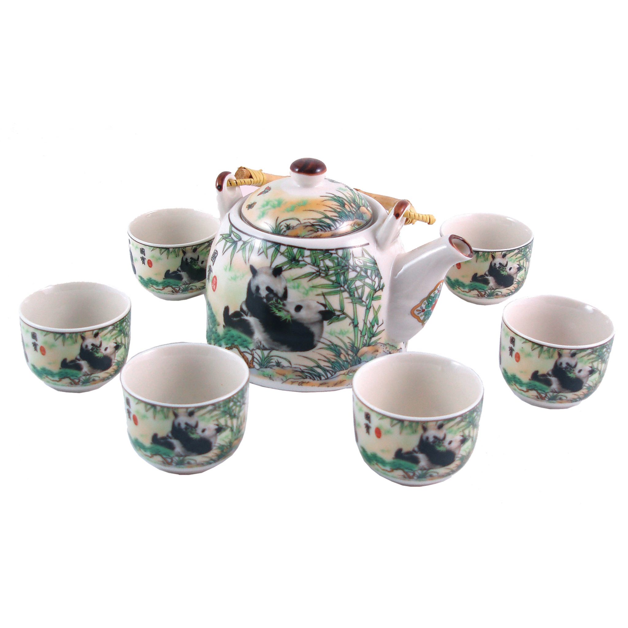 White porcelain traditional teapot decorated with a colourful scene of pandas in a grove of bamboo. Includes flexible bamboo handle and metal insert strainer along with six matching cups .