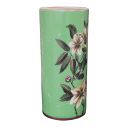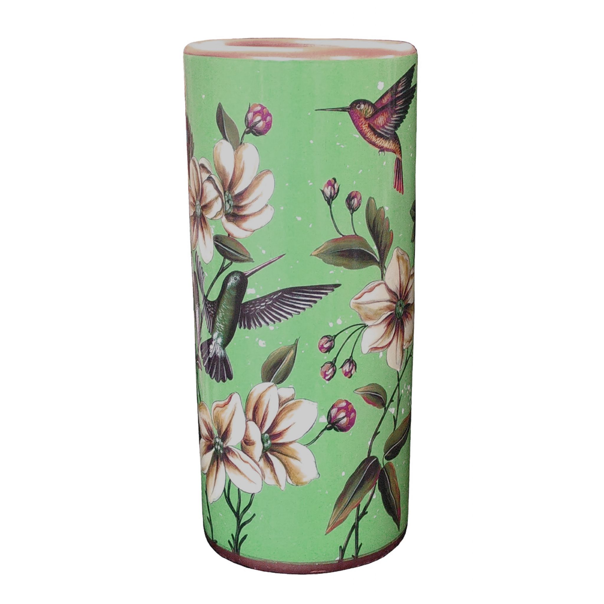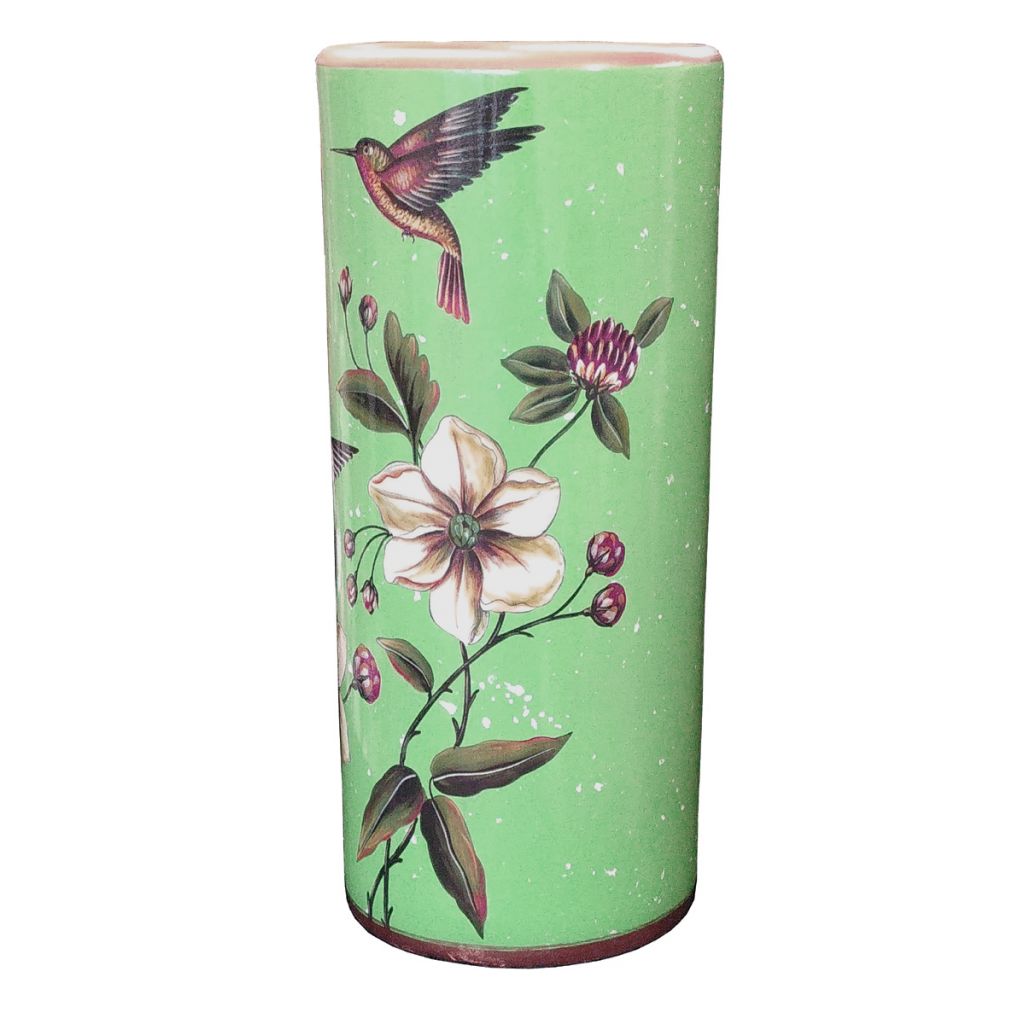 Umbrella Stand decorated with Humming Birds and nectar rich creamy flowers on a base of white-flecked turquoise green.