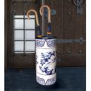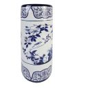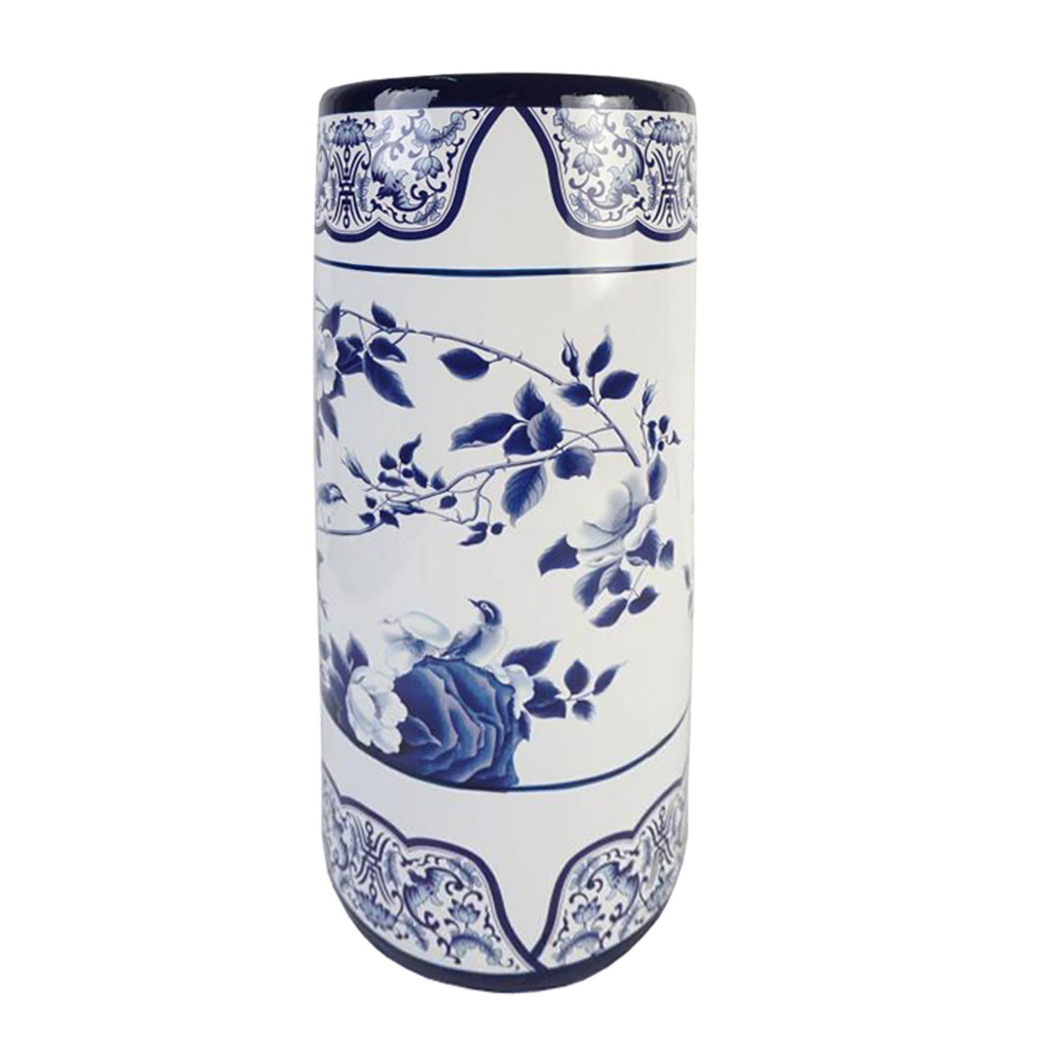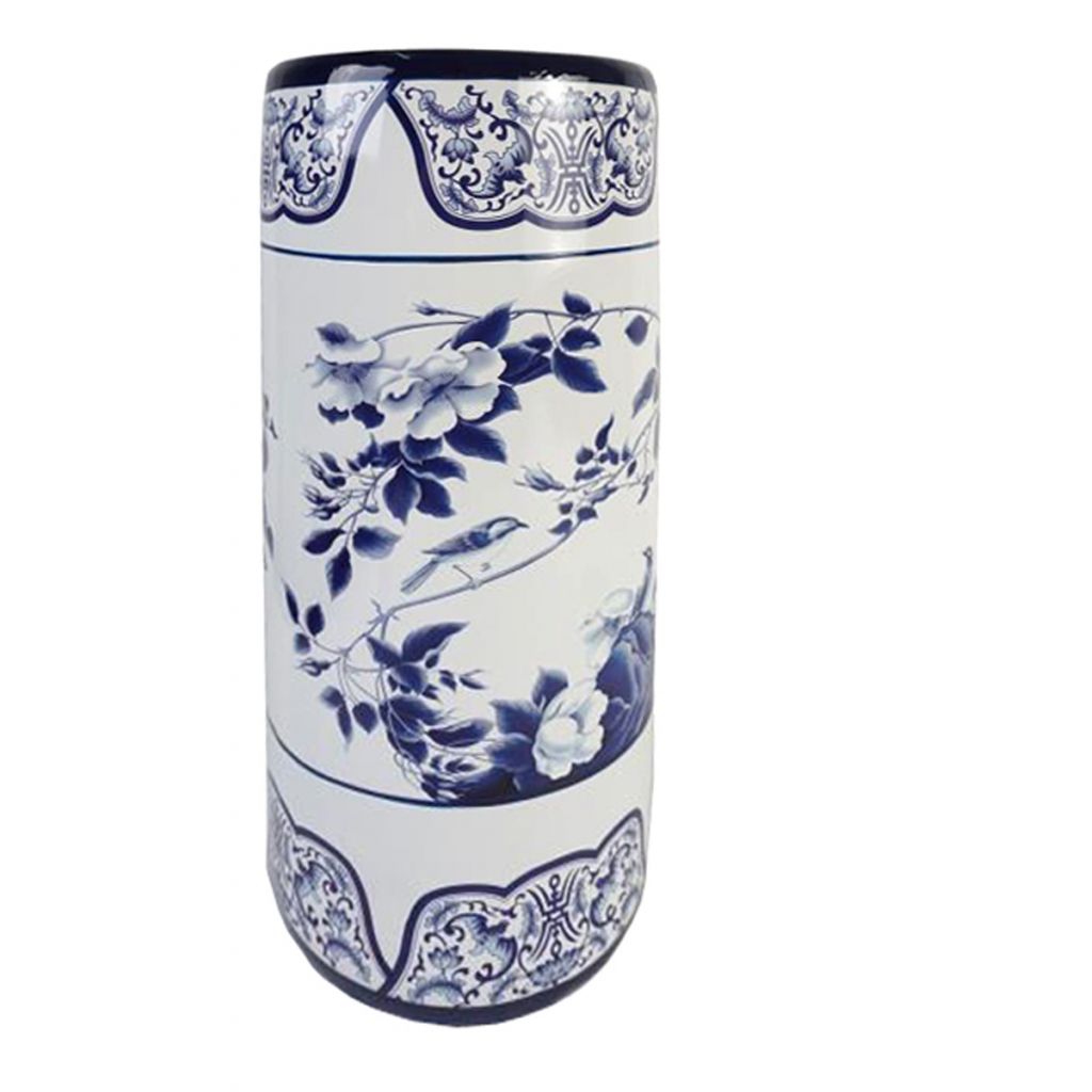 Porcelain Umbrella Stand decorated in traditional blue and white with garden birds exploring the branches of a traditional rose.
