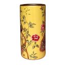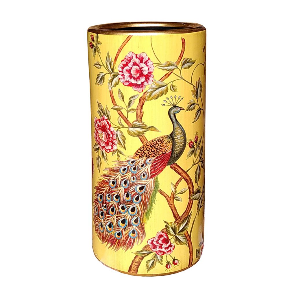 Porcelain Umbrella Stand decorated with magnificent peacocks perched on the branches of a tree peony. Colourful peacocks with pink flowers and green foliage on a creamy yellow base.