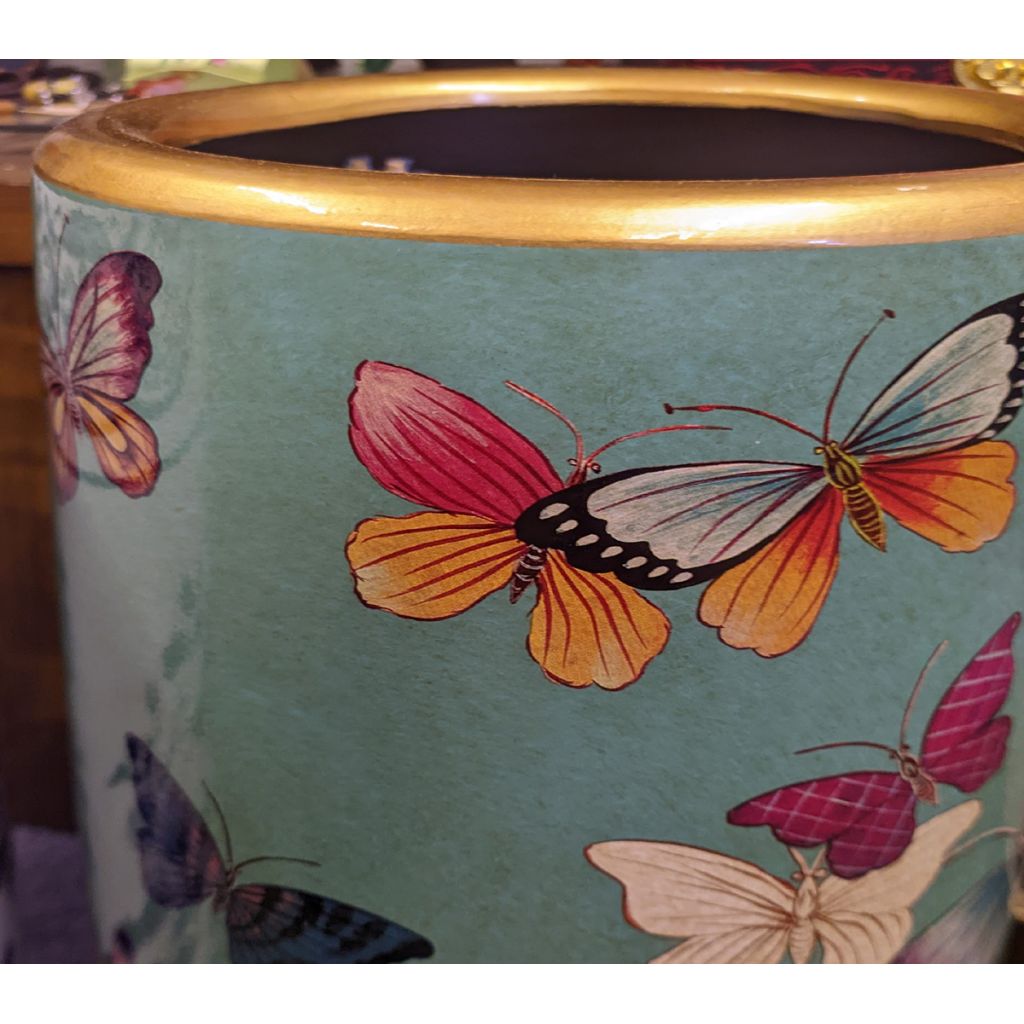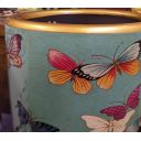 Porcelain Umbrella Stand decorated with a multitude of colourful butterflies on a turquoise base.