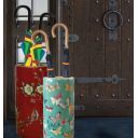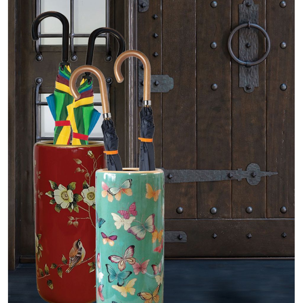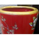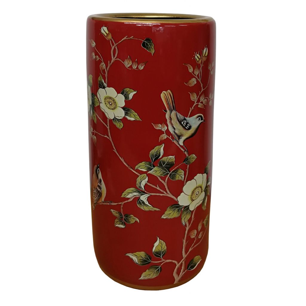 Porcelain Umbrella Stand decorated with colourful chaffinches among branches of creamy white flowers and green foliage on a red base.