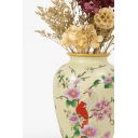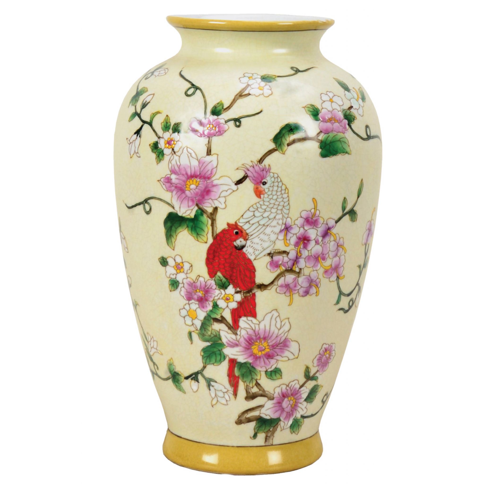 Crested parrots amidst a flowering vine on a creamy coloured finely crackled porcelain vase.