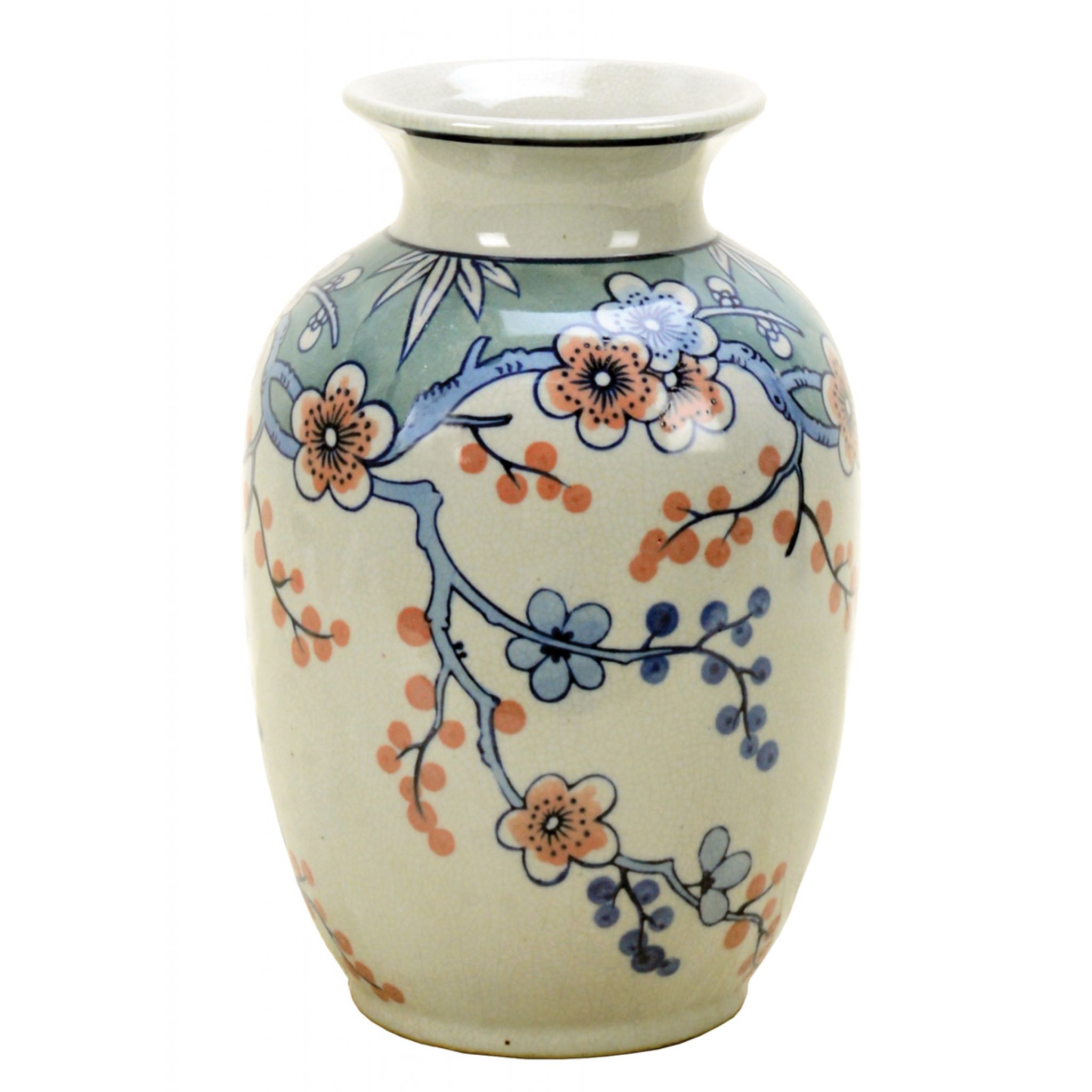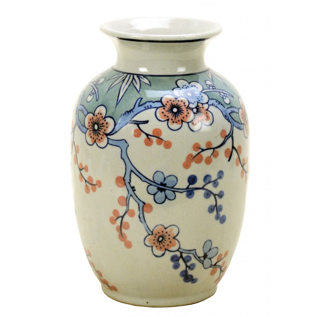 Vase in crackled ivory with blue and pink plum blossom decoration.
