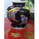 Gloss black squat vase decorated with a kaleidoscope of butterflies..