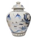 General Jar in darkly crackled antique-white porcelain decorated in blue with a richly-textured classical landscape scene. Scene includes trees and rock formations, pagoda and fishing boats, birds and sailboats, village and farmers.