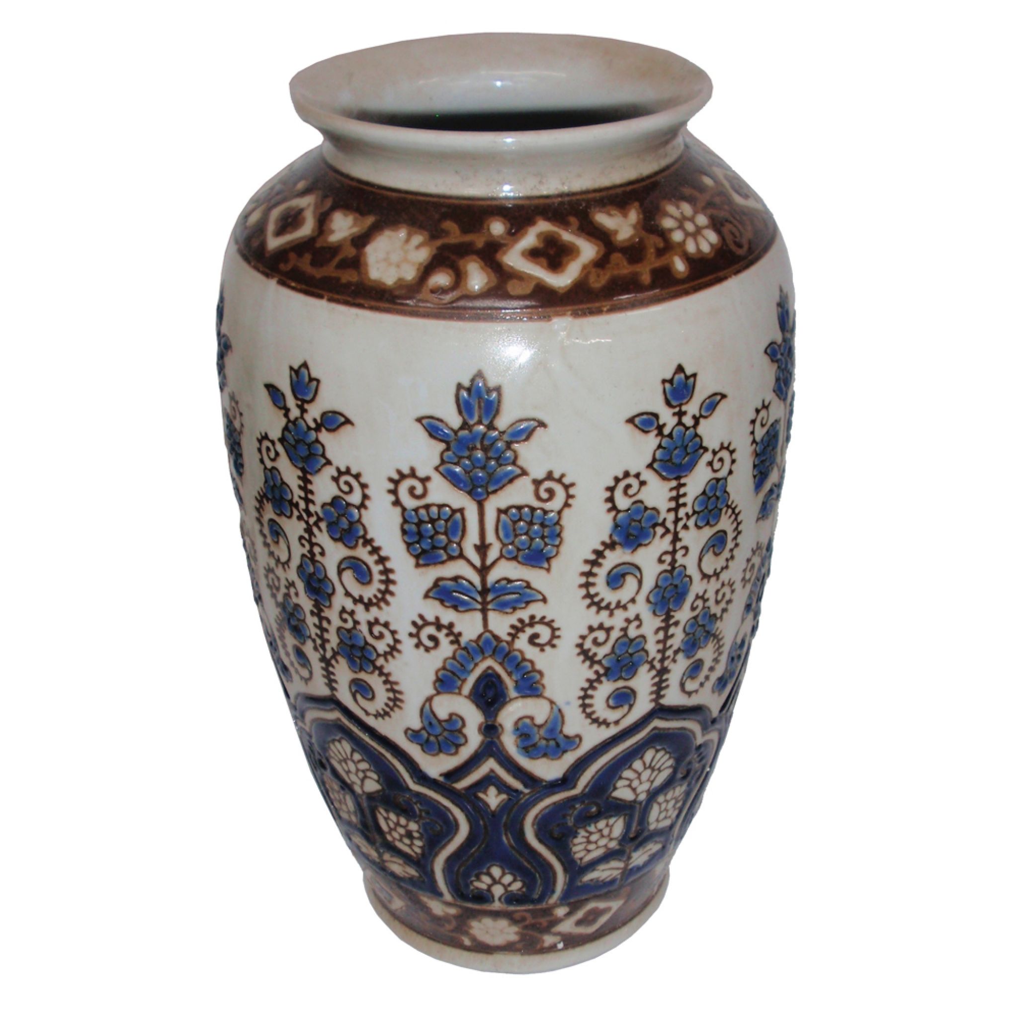 Vase in ivory with blue and brown floral motifs in textured relief.
