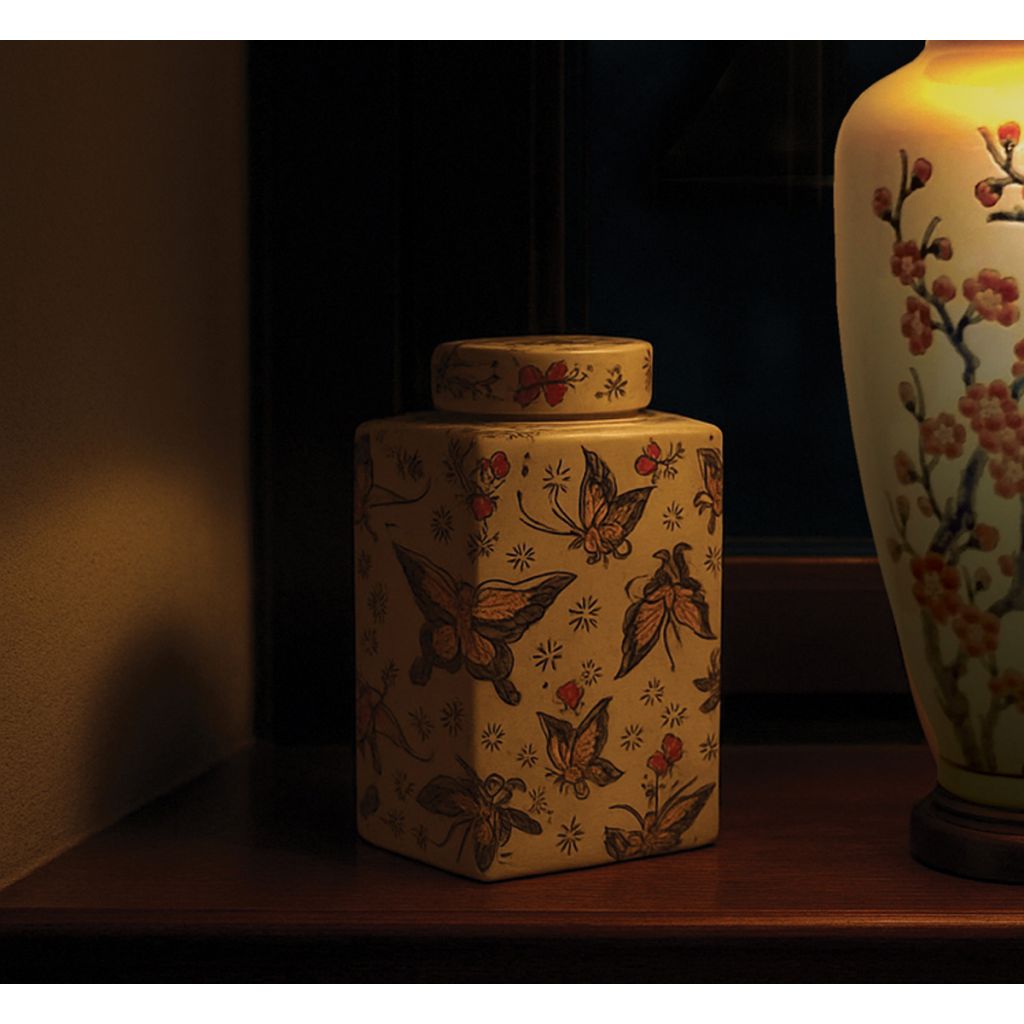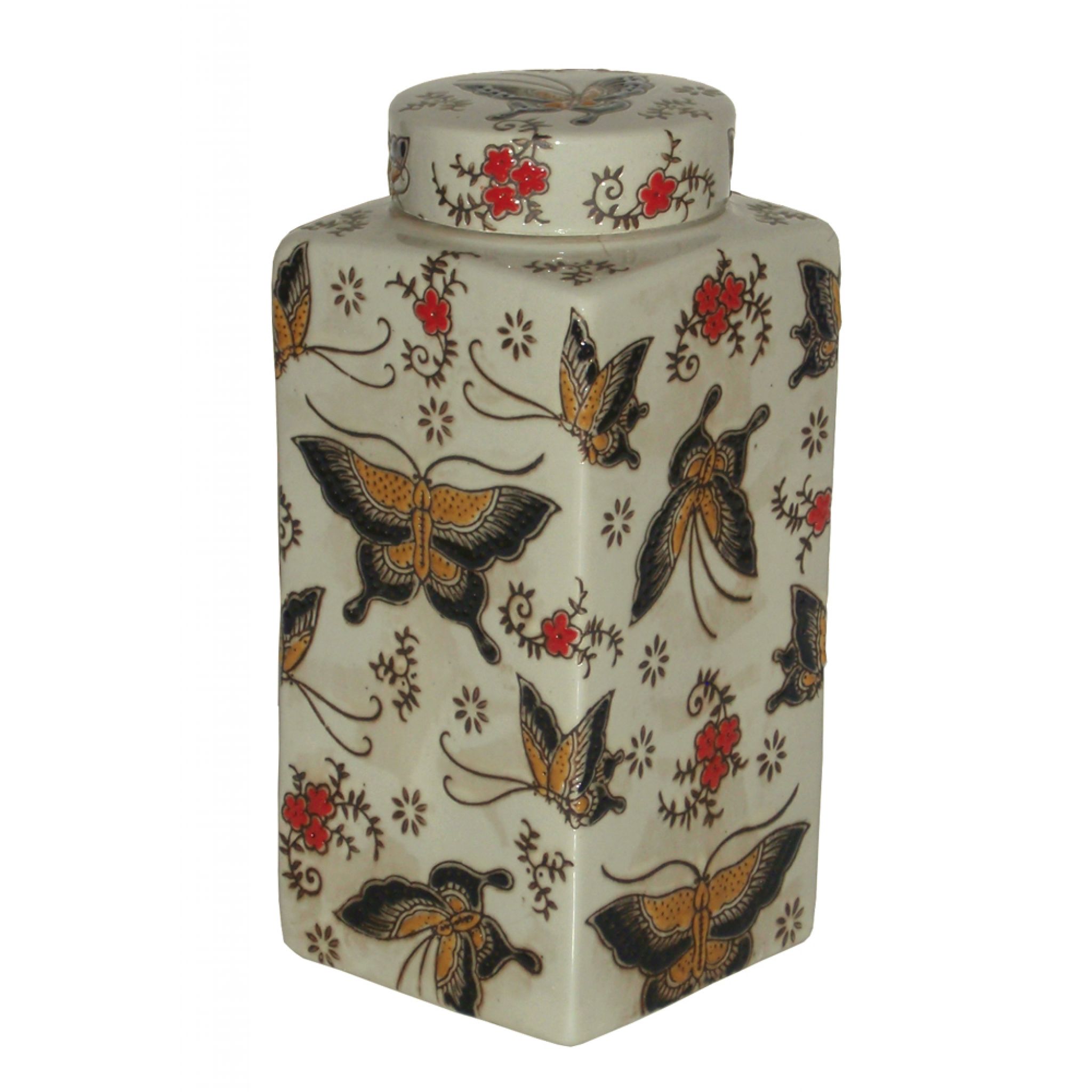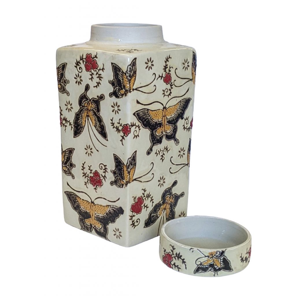 Tea Caddy decorated with textured butterflies in black, red and mustard on a creamy background. Finish matches JC9955 Butterfly Lamp.