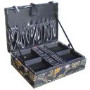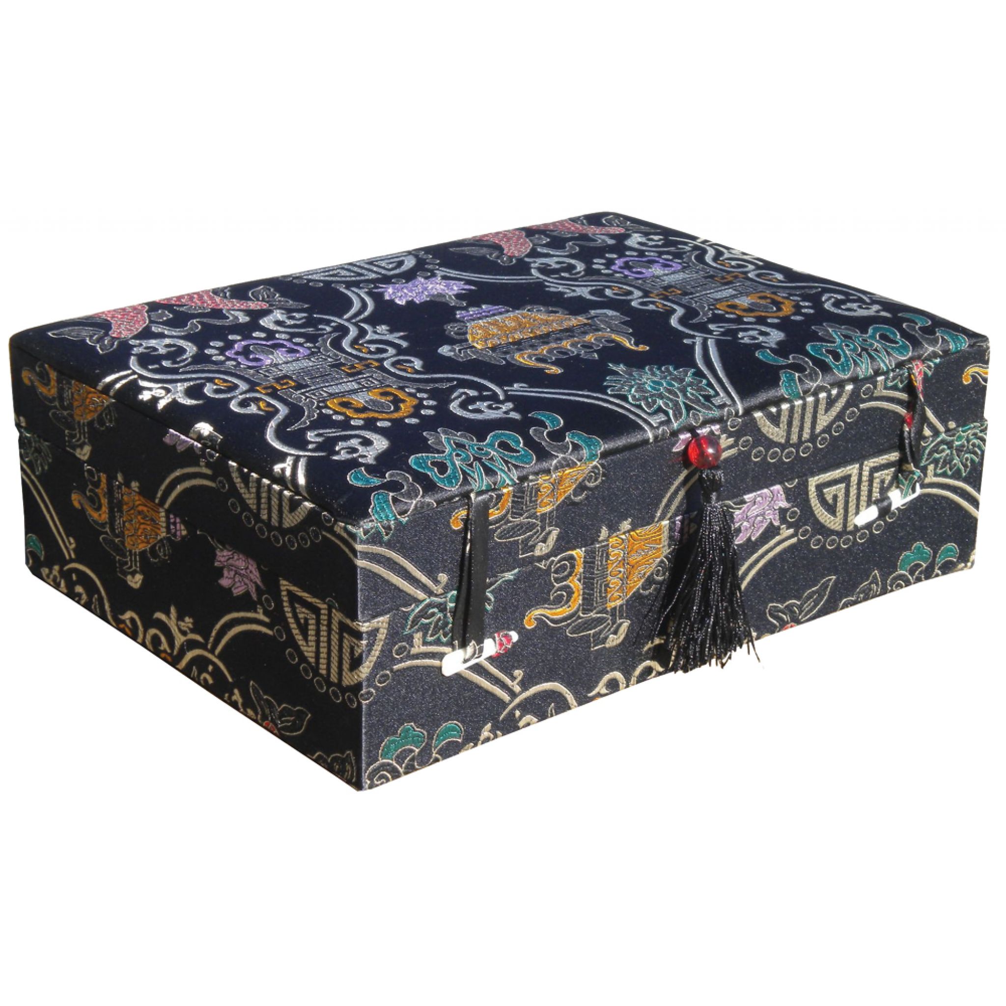 Brocade covered jewellery box in a matt black silky brocade decorated with a shimmering pattern of motifs in silver, green, red, yellow and mauve. Finished inside in black faux silk, the main part is divided in to three compartments with a lift-out upper tray containing a further four compartments and ring holders. Also features a pocket for larger items beneath the lid and a tassel handle.