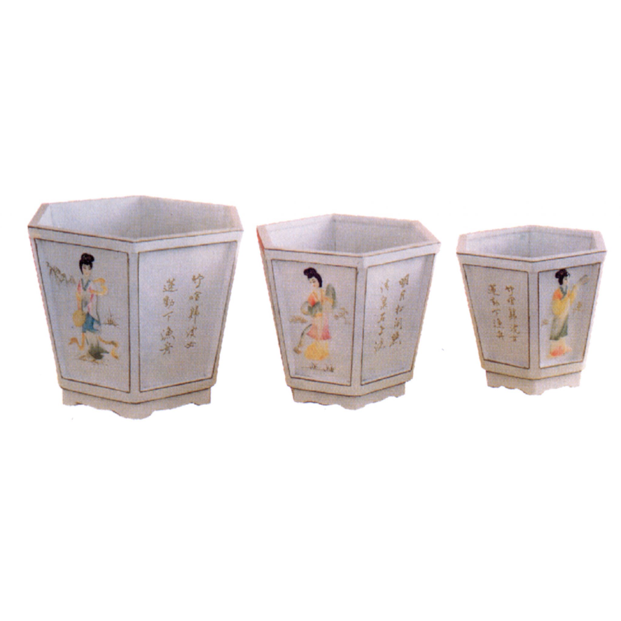 Set of three hexagonal wooden planters in ivory with alternate panels of calligraphy and dyed shell pictures of ladies or scenery. Includes hand painted characters and decoration in gold. Completely hand made in a shabby chic style.