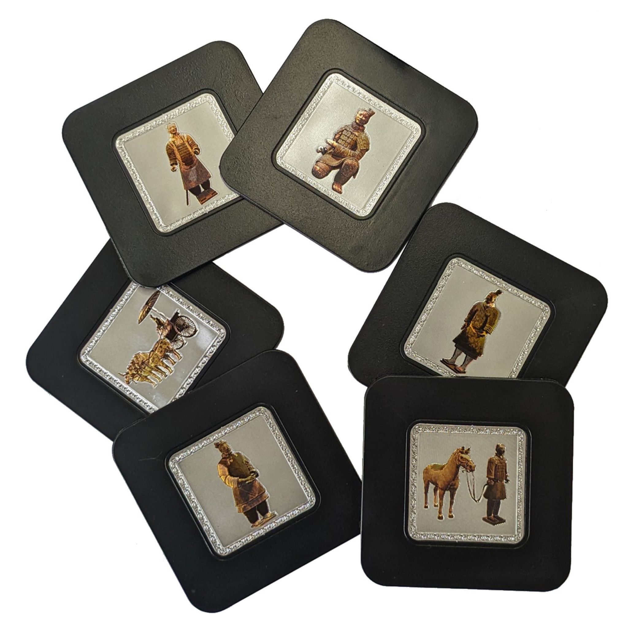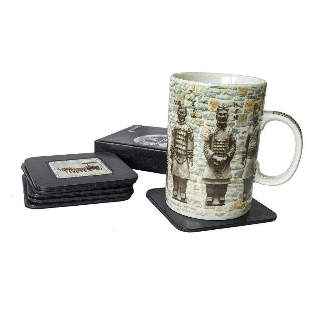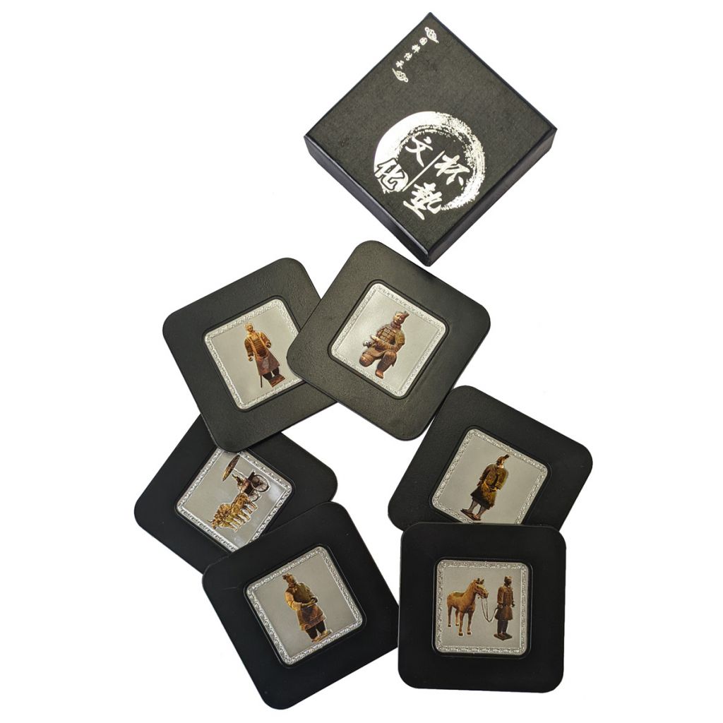 Set of six foam-backed coasters with terracotta warrior themed decoration. Each coaster features a different image of Terracotta Army members.