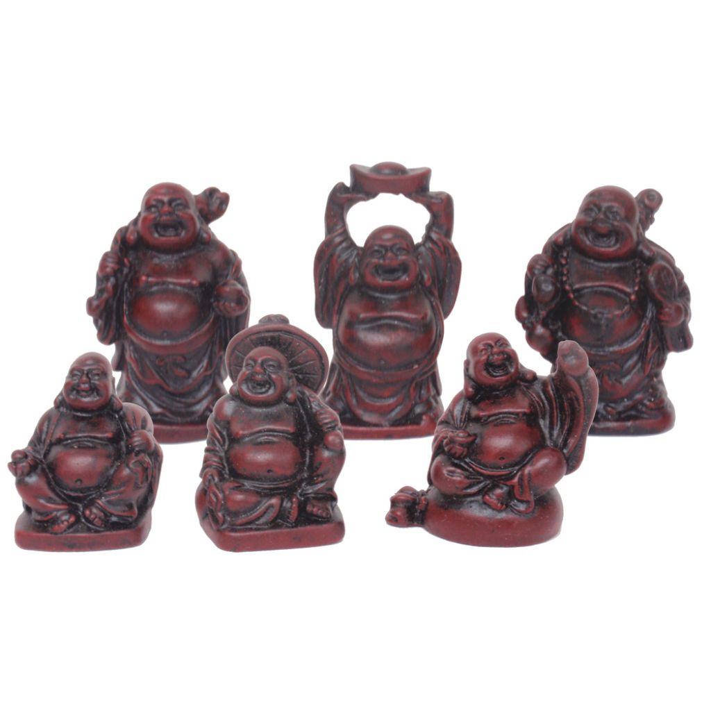Set of six Buddhas in different poses. Set includes three sitting and three standing happy Buddhas all holding pearls, gold, sacks of wealth etc.