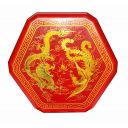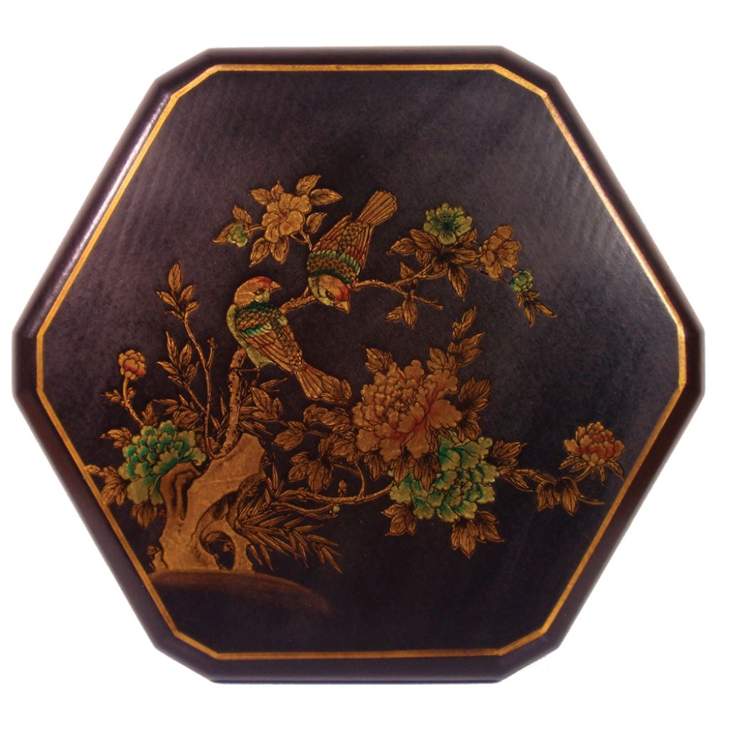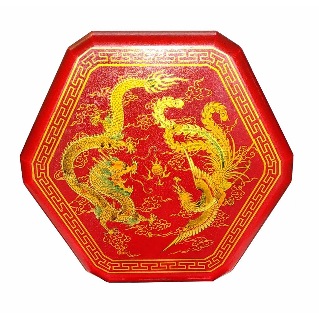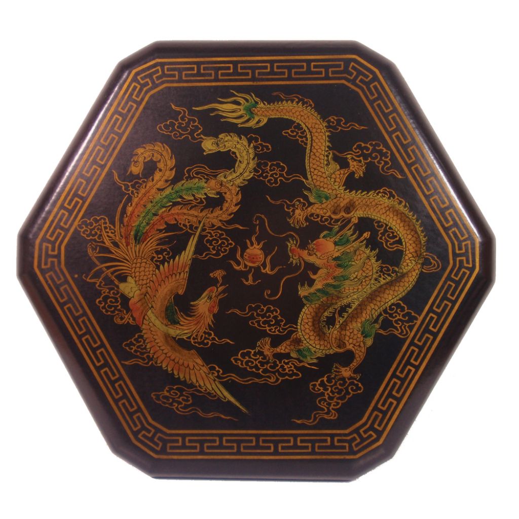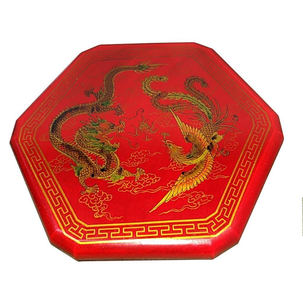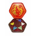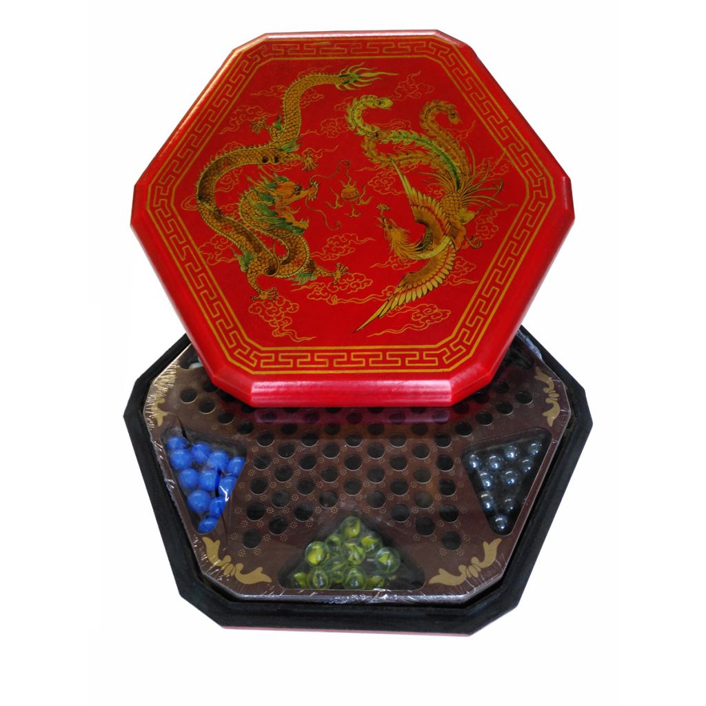 Chinese chequers set in aged-looking leatherette box embossed with decoration of Chinese themes. Contains six sets of wooden playing pieces in different colours. Currently available in three designs: Red Dragon & Phoenix, Red Birds & Flowers, Black Birds & Flowers.