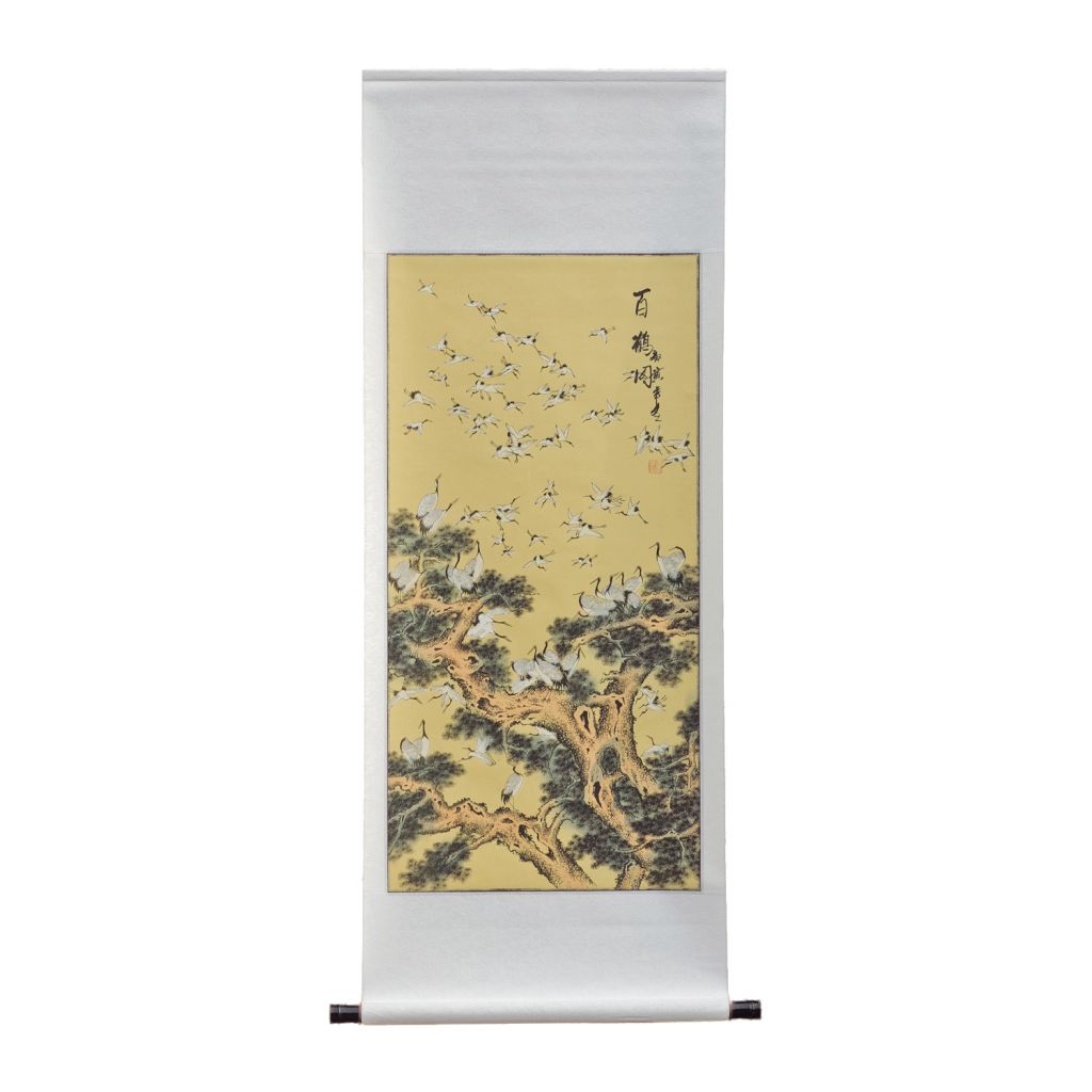 Hand painted scroll showing a mature pine tree in a scene abundant with cranes. The Chinese description for this style of painting translates to One Hundred Cranes, a scene representing determination and power combined with the fabled longevity of the crane. Includes hanging / tying ribbon and paper-backed brocade mount.