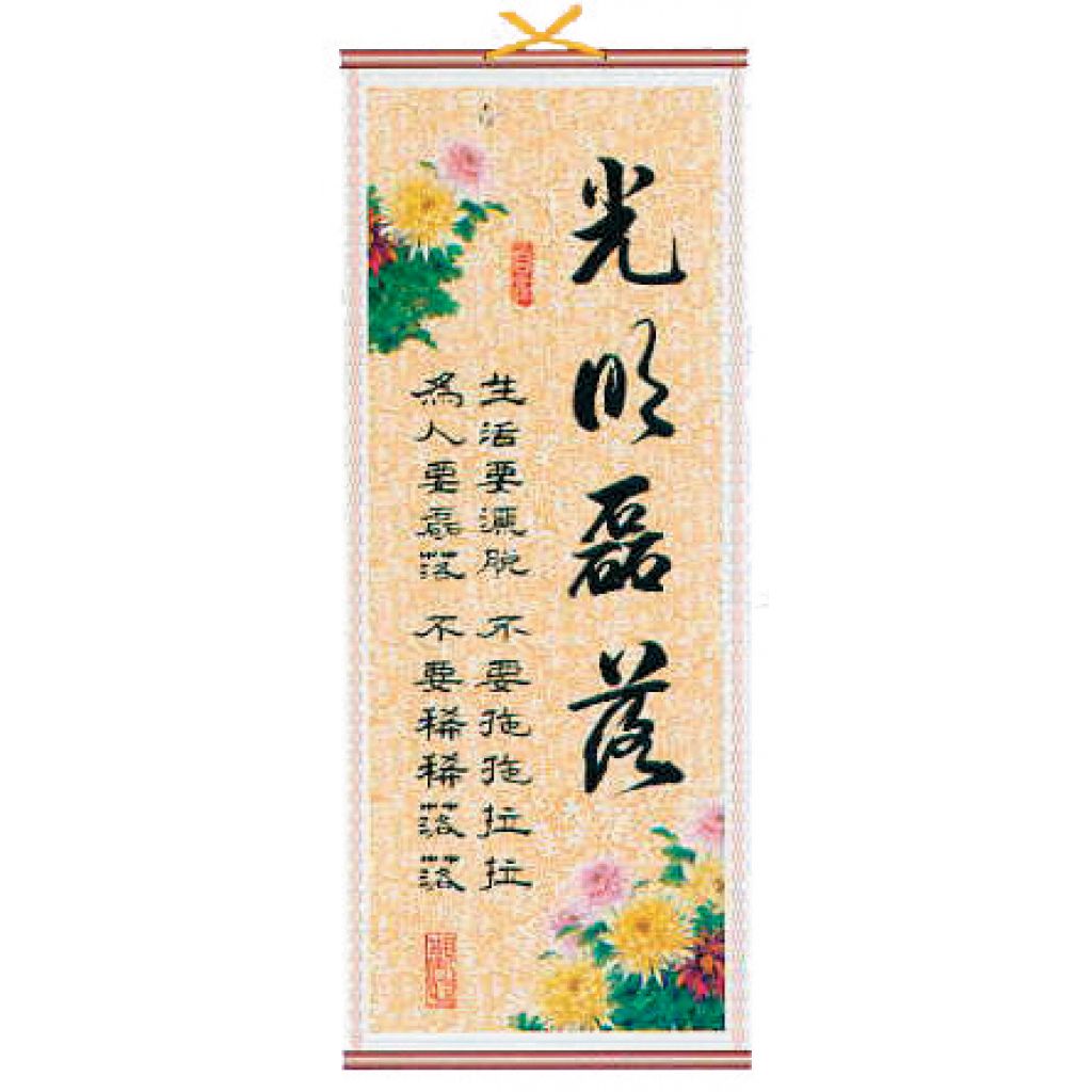 Cane and paper scroll with calligraphy and floral decoration. Translates as 'Open and above-board. In your everyday life you should be decisive (sa sa tuo tuo) and should not dilly dally (tuo tuo la la); you should be straight (lei lei luo luo) with people and not wishy washy (xi xi luo luo).